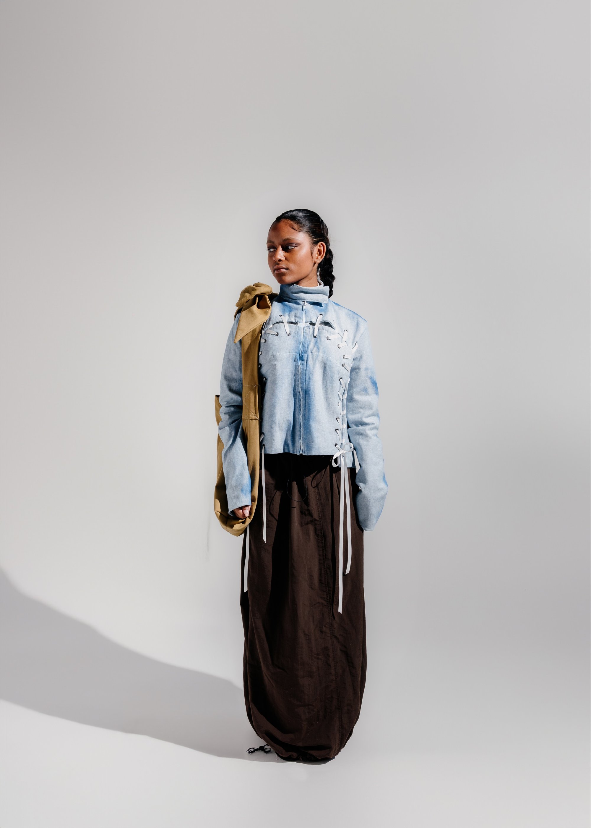 cargo maxi skirt in sepia, toggle waist and hem to synch to your liking. nylon waterproof fabrication.